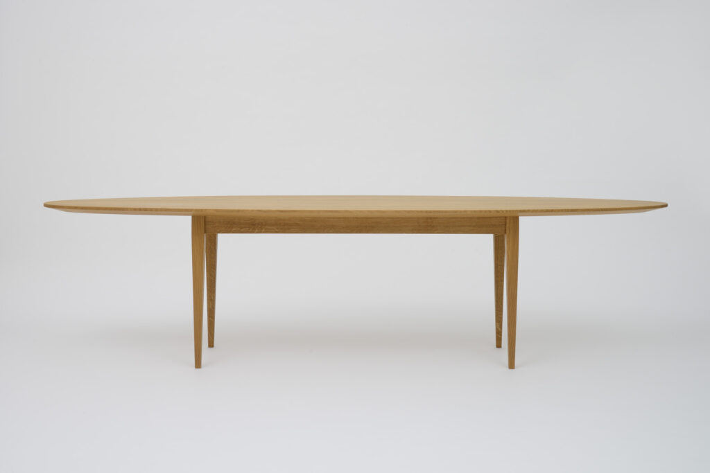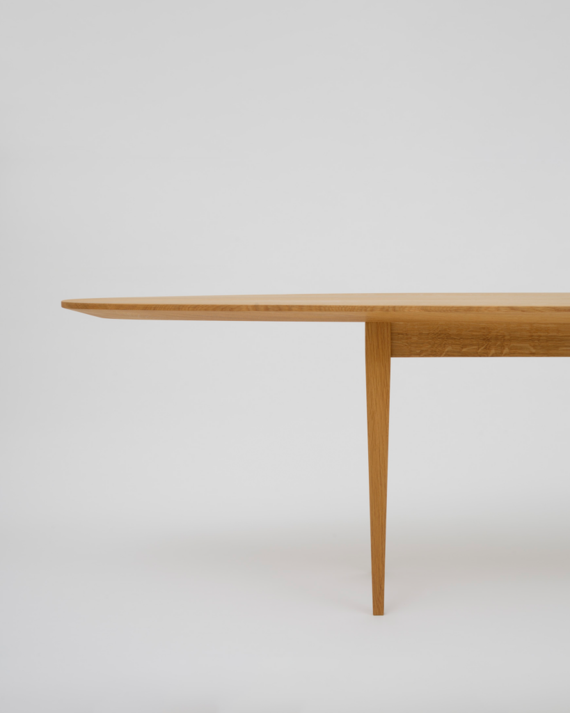 Entwurf eines ovalen Couchtischs aus massiver Eiche mit flach auslaufender Tischkante
