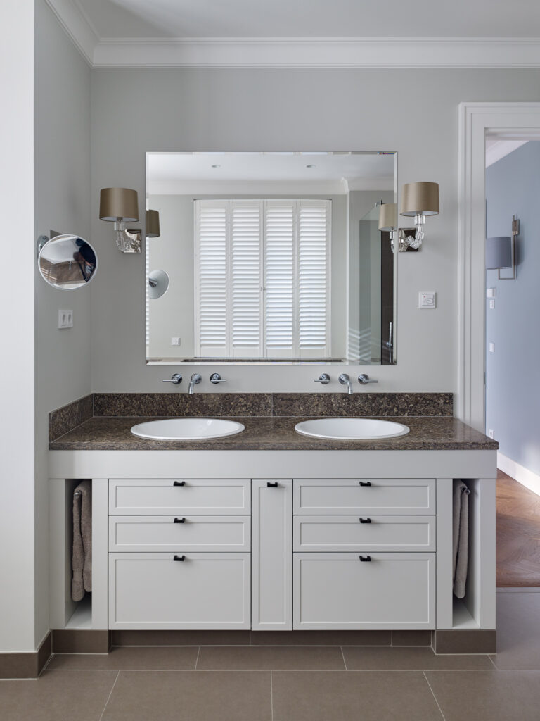 Für das Arbeitszimmer wurde eine Möbelkombination aus Schreibtisch und funtionalem Highboard entworfen. Jedes Schlaf- und Gästezimmer hat auf kurzem Wege Zugang zu einem dazugehörigen Badezimmer, welches jeweils eine den Bedürfnissen entsprechende Gestaltung und Mobiliar erhalten hat. Im Dachgeschoss finden Gäste ein Möbel zur Unterbringung von Kleidung, sowie einen kleinen Pantrybereich für Erfrischungen vor. Neben festen Austattungselementen wurden auch Einzelmöbel wie Sideboards für den Ess- und Wohnbereich entwickelt. Im Untergeschoss ergänzt ein Fitness- und Saunabereich die Wohnräume.
