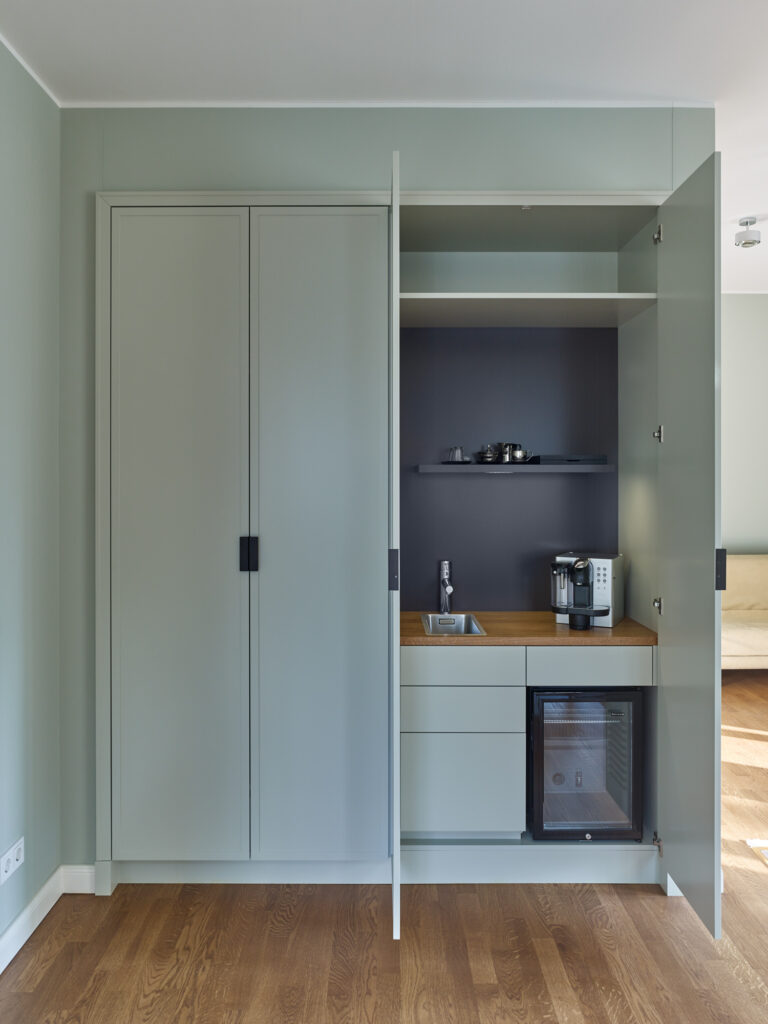 Der Innenausbau umfasste den Entwurf sowie die Planung und Ausführung von einer Vielzahl verschiedenster Räume und Möbel, die einem abgestimmten Material- und Farbkonzept folgen. Dazu zählen unter anderem großzügige Einbauten, wie eine nahe dem Eingang gelegenen Garderobe mit Sitzbank und eine an das Schlafzimmer anschließende Ankleide.